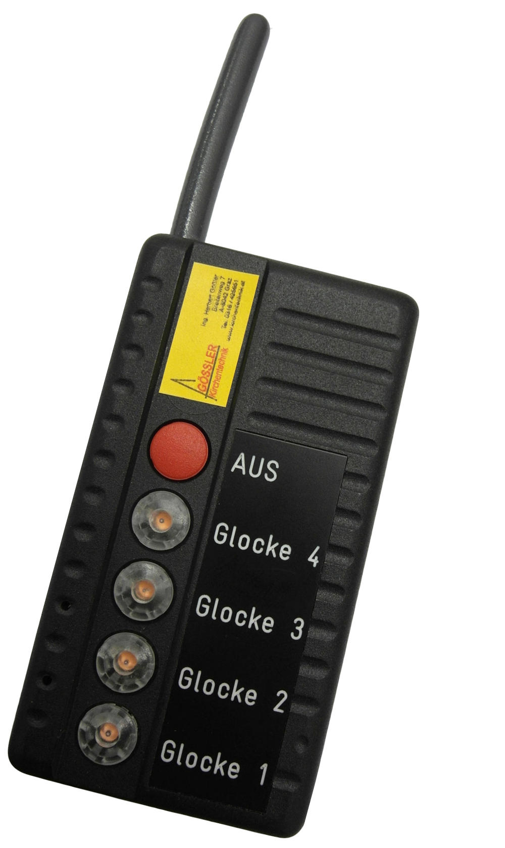 Funkfernsteuerungen sind sehr einfach für die Be-dienung der Glocken. Mit dem kleinen Handsender können Sie die einzelnen Glocken aus einer Entfernung von bis zu 2000 Metern ein- und ausschalten. Sie können den Schaltzustand der Glocken mittels Anzeige an den Kontrolllampen am jeweiligen Taster erkennen. Ein Druck auf den jeweiligen Taster schaltetet die Glocke ein - die rote Lampe leuchtet zur Kontrolle - ein nochmaliger Druck auf den Taster schaltet die Glocke aus und die rote Lampe erlischt. Ein Druck auf die Taste ‘Aus’ schaltet alle eingeschalteten Glocken gleichzeitig aus.